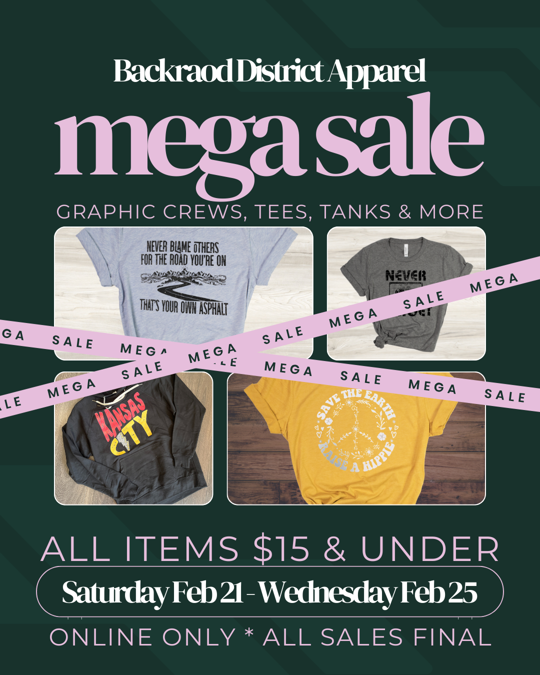 Like a warehouse sale but better! All graphics under $15! That includes tees, tanks, crews, hoodies and more!