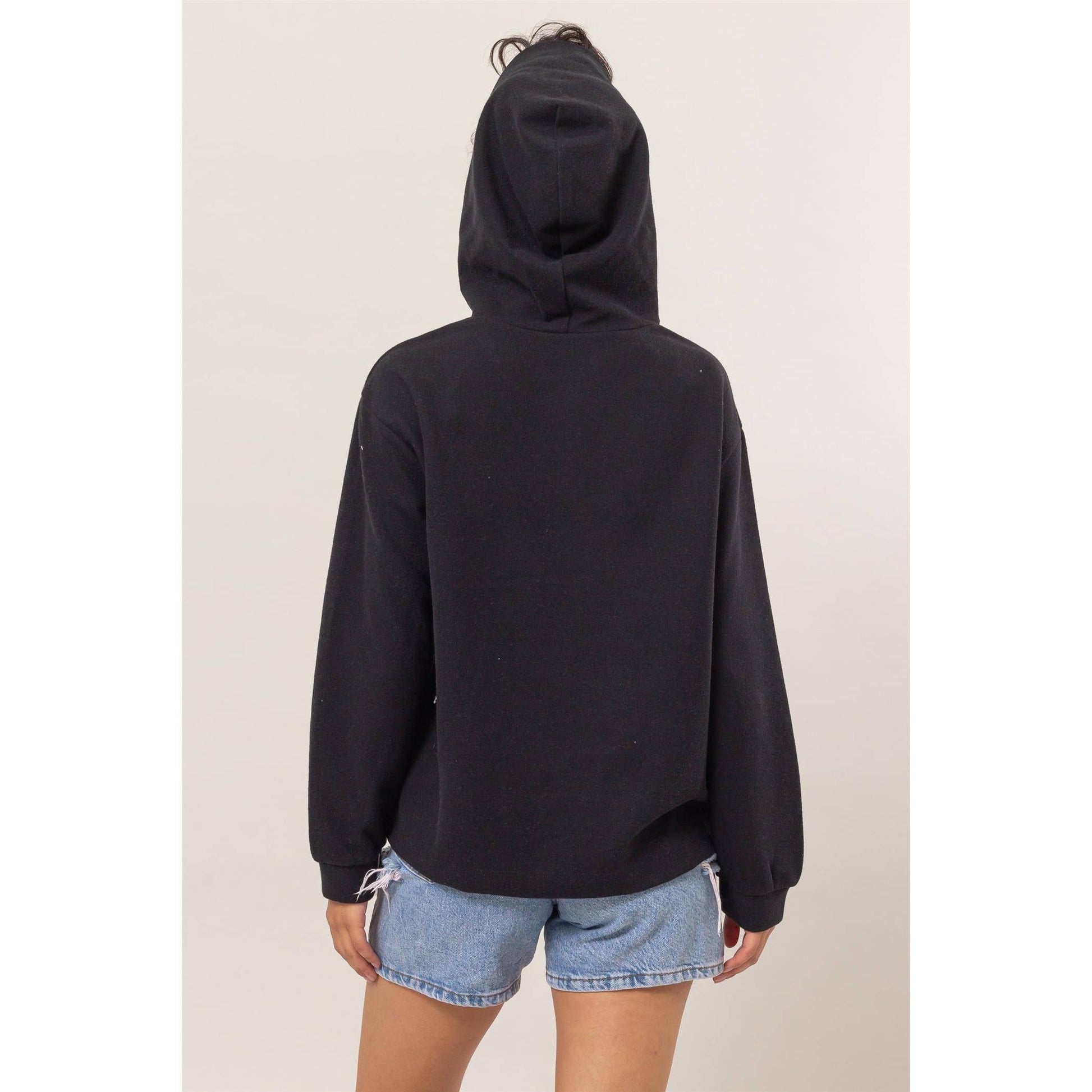 Kick back in effortless style with this laid-back hoodie that's all about comfort and cool vibes. The roomy fit and dropped shoulders create that perfectly relaxed silhouette, while the cinched cuffs and cozy hood keep things snug. Crafted from a soft polyester-rayon blend, it's your go-to piece for lounging, running errands, or just embracing a slower pace. Pair it with matching sweats for the ultimate comfort outfit.